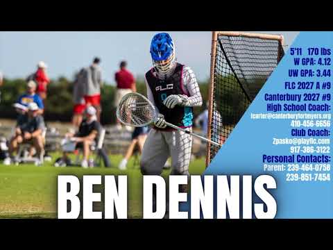 Benjamin Dennis Class of 2027 Canterbury School of Fort Myers Lacrosse Goalie GPA: 4.12 (Weighted) Height / Weight: 6’0” | 170 lbs Location: Fort Myers, Florida Email: morludennis@icloud.com Phone: 239-851-7454 Coach Contact: Coach Carter tcarter@canterburyfortmyers.org Coach Pasko Zpasko@playflc.com