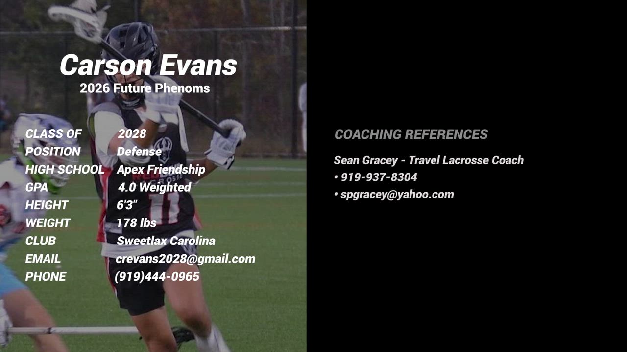 Theodore Wesley Slowik (2027 Goalie) Red Devil - Sweetlax (Apex, NC) Coaches - Coach Tom Kinney and Scott Olive Tom Kinney - (602) 679 - 0705, thomaskinney@live.com Scott Olive - (631) 902 - 8022, scott@lacrossetrainer.org C. E. Jordan High School (Durham, NC) Music Used in Video Song - The Show Goes On Artist - Lupe Fiasco